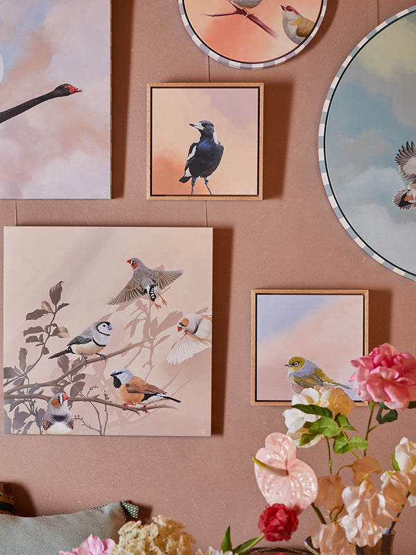 Feathered Folk is a heartfelt collection by artist Teneille Grace, born from quiet moments of presence during a difficult chapter in her life. What began as simple birdwatching during cancer treatment, became a grounding ritual—an invitation to pause, observe, and reconnect. Over time, the birds grew into gentle companions in her studio, each one painted with its own spirit and personality. Some were playful and bold, others reflective and soulful. Together, they reflect the beauty of the everyday, the comfort of quiet connection, and the tender messages of hope that show up when you’re paying attention.
